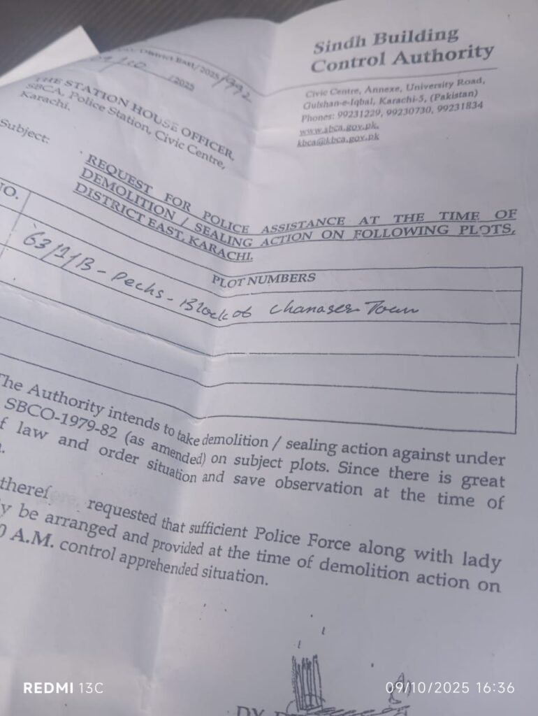 Karachi (Staff Reporter): The alleged illegal construction underway on Plot 192-C in PECHS Block 2, and the continuous inaction of the Sindh Building Control Authority (SBCA), has once again brought the city’s rising corruption problem into the spotlight.