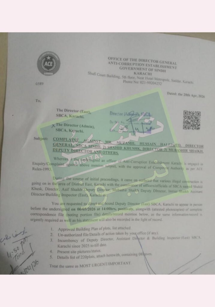 Karachi (Staff Reporter) In a significant development, the Anti-Corruption Establishment (ACE), Government of Sindh, has initiated a formal inquiry against senior officials of the Sindh Building Control Authority (SBCA) over alleged involvement in illegal constructions across Karachi.