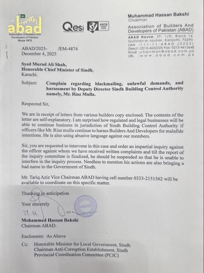 Serious allegations have surfaced against Sindh Building Control Authority (SBCA) Deputy Director for District West, Riaz Hussain Mulla, after the Association of Builders and Developers of Pakistan (ABAD) formally submitted a complaint to Chief Minister Sindh, Syed Murad Ali Shah. Despite the gravity of the charges, the Sindh government has yet to initiate any action, triggering widespread criticism and raising concerns regarding potential institutional protection for the accused officer.